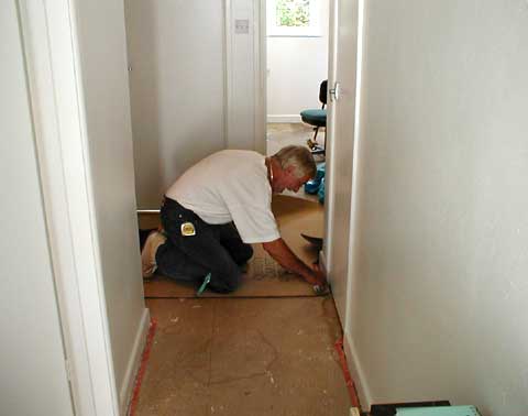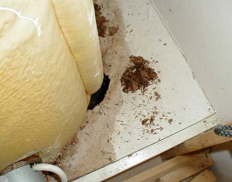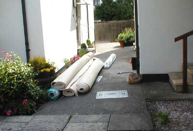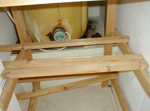 UUhh oh - everything is soaking wet Turns out the tank has been leaking for at least a year - everything is rusted and the chipboard the tank is sitting on just crumbles away in your hand. 'Very dangerous' says Paul the plumber. Paul comes back on Monday - puts his foot through the floor trying to get the old tank out - stays till 10pm putting it all back together again. Sadly no action shots - I think that would have been the last straw for Paul the plumber. Carpet only a little soiled. |